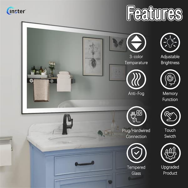LINE 72 in. W x 36 in. H Rectangular Black Framed Wall Mount Anti-Fog Bathroom Vanity Mirror with LED Light and Memory