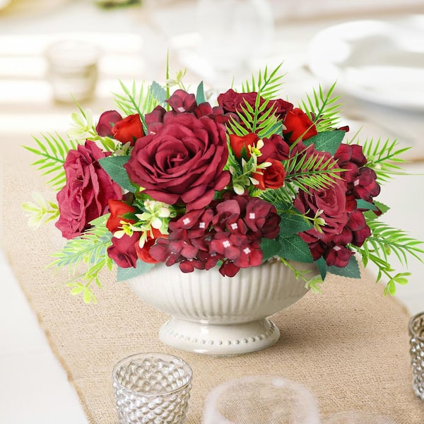 11 in. Burgundy Red Artificial Delicate Mixed Rose Hydrangea Flower Stem Bush Bouquet (Set of 4)