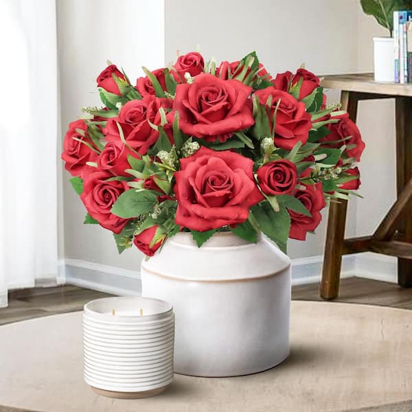 13 in. Petite Red Artificial Tea Rose Flower Stem Bush Bouquet (Set of 4)