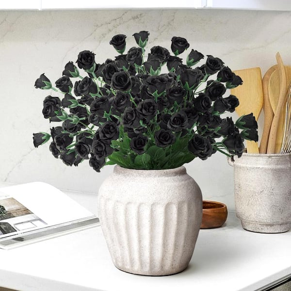 14 in. Black Artificial Mini Rose Bud Flower Stem Bush Bouquet (Set of 12)