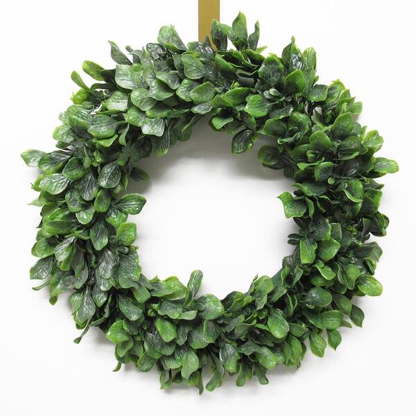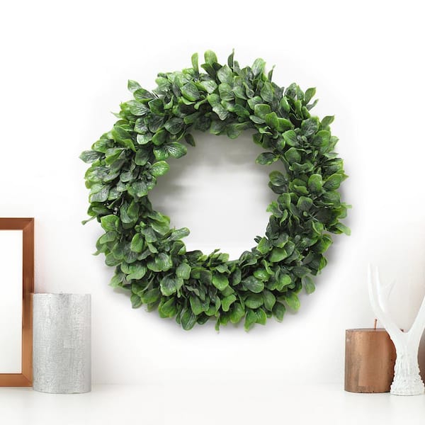 14 in. Frosted Green Artificial Spring Leaf Foliage Greenery Wreath