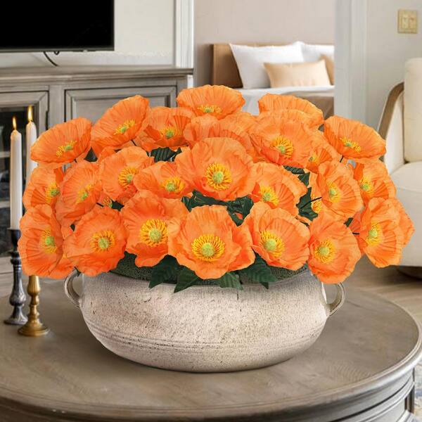14 in. Orange Artificial Poppy Flower Stem Bush Bouquet (Set of 12)