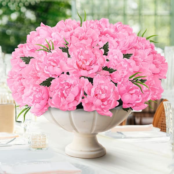 14 in. Pink Artificial Open Peony Flower Stem Bush Bouquet (Set of 12)