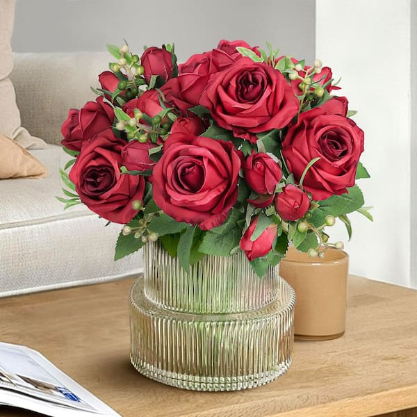 14 in. Red Artificial Delicate Sweet Rose Flower Stem Bush Bouquet (Set of 2)
