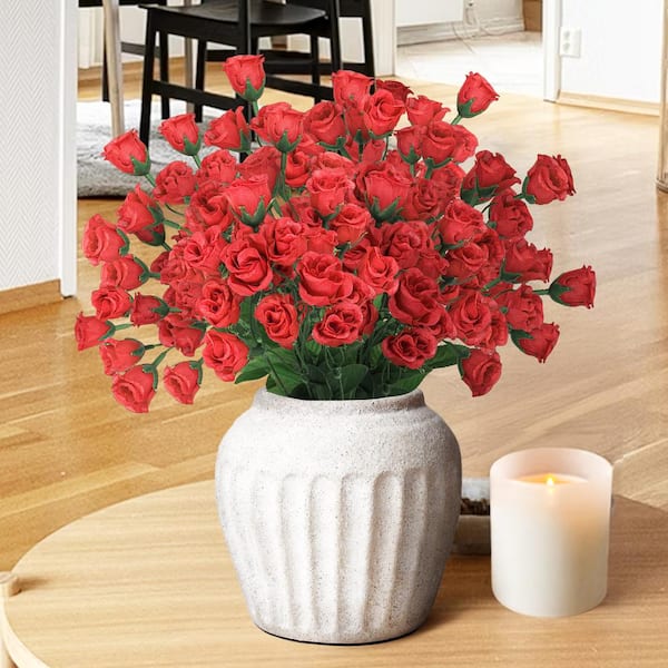 14 in. Red Artificial Mini Rose Bud Flower Stem Bush Bouquet (Set of 12)
