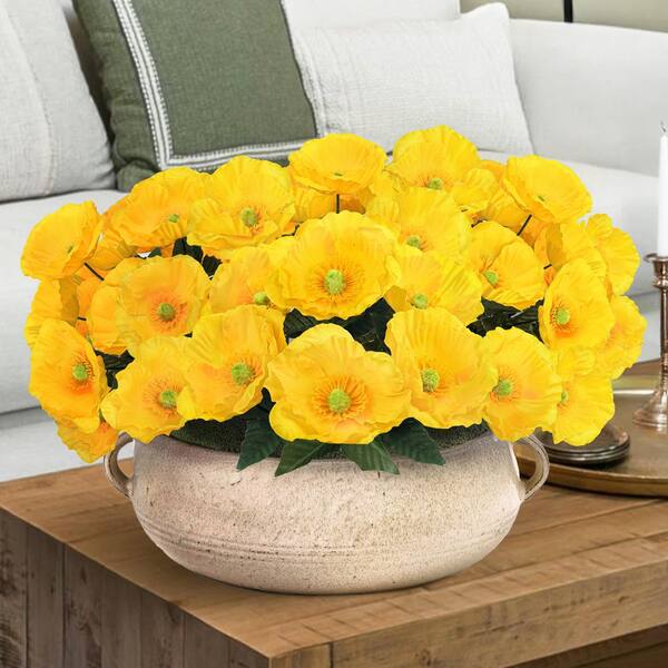 14 in. Yellow Artificial Poppy Flower Stem Bush Bouquet (Set of 12)
