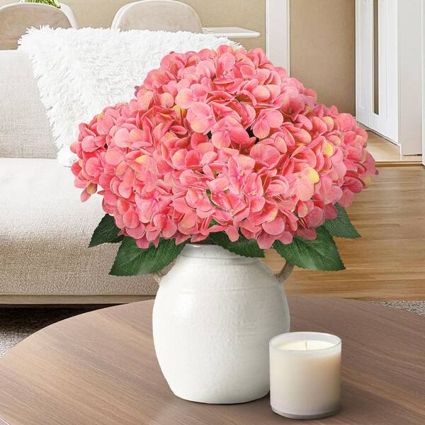 18 in. Coral Pink Natural Touch Artificial Hydrangea Flower Stem Bush Bouquet (Set of 2)