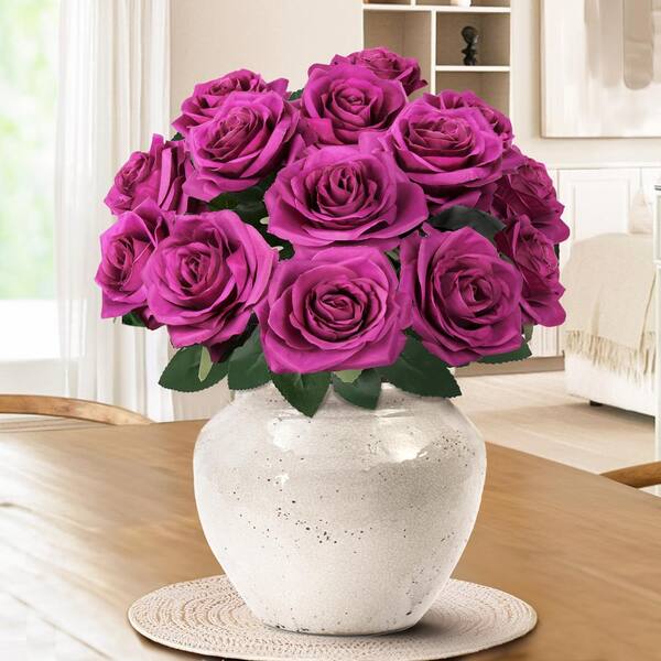 18 in. Deluxe Fuchsia Plum Artificial Queen Rose Flower Stem Bush Bouquet (Set of 2)