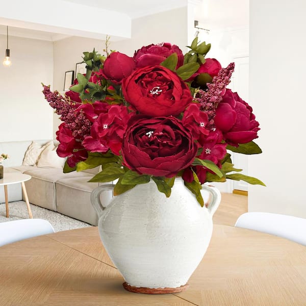 19 in. Burgundy Red Artificial Mixed Peony Hydrangea Flower Stem Bush Bouquet
