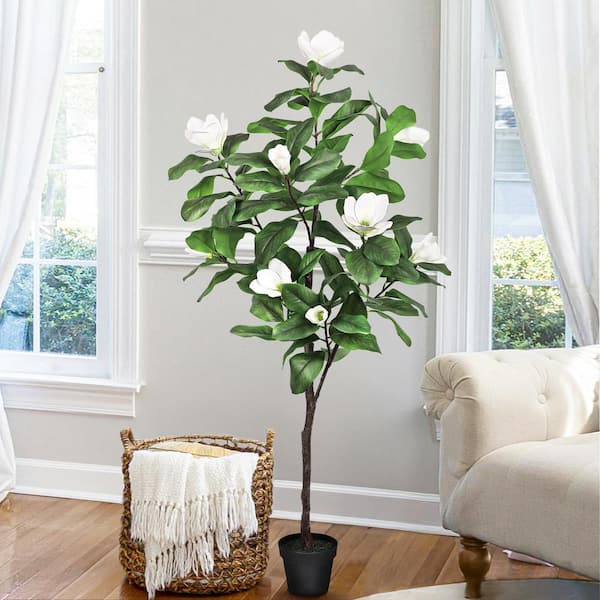 5 ft. Real Touch White Artificial Magnolia Flower Tree in Black Pot