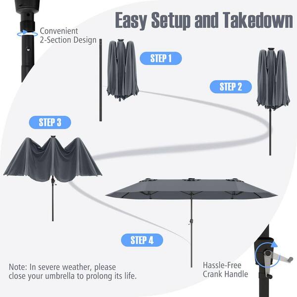 15.5 ft. Steel Extra-Large Market Patio Umbrella in Gray with LED Solar Lights and Crank Handle (Stand Not Included)
