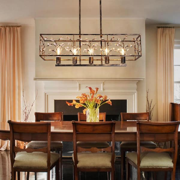 35.43 in. 5-Light Vintage Antique Bronze Rectangle Crystal Chandelier for Dining Room