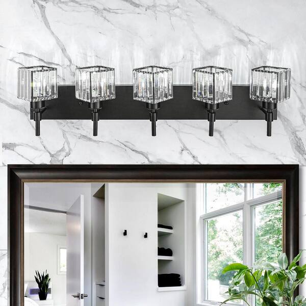 Schonbek 33.1 in. 5-Light Black Dimmable Bathroom Vanity Light with Crystal Shades