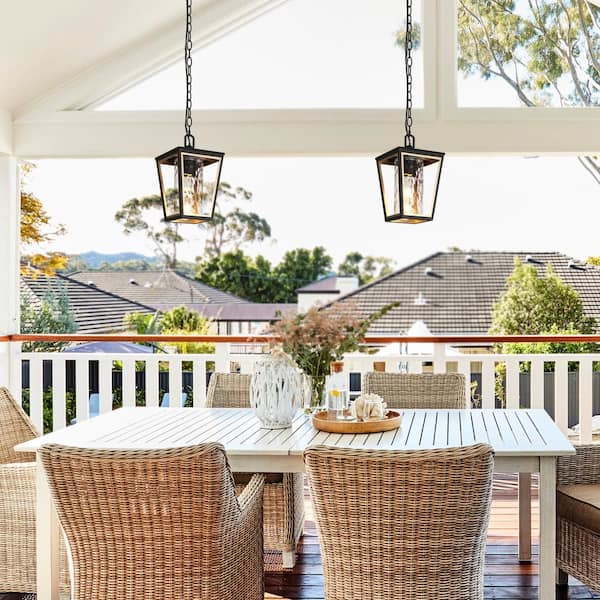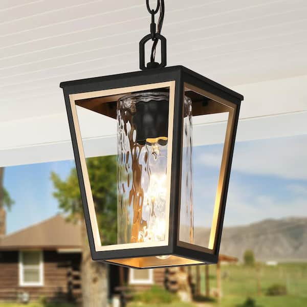 12.2 in. 1-Light Black Gold Cage Outdoor Pendant Light with Cylinder Water Ripple Glass Shade for Outdoor Covered Areas