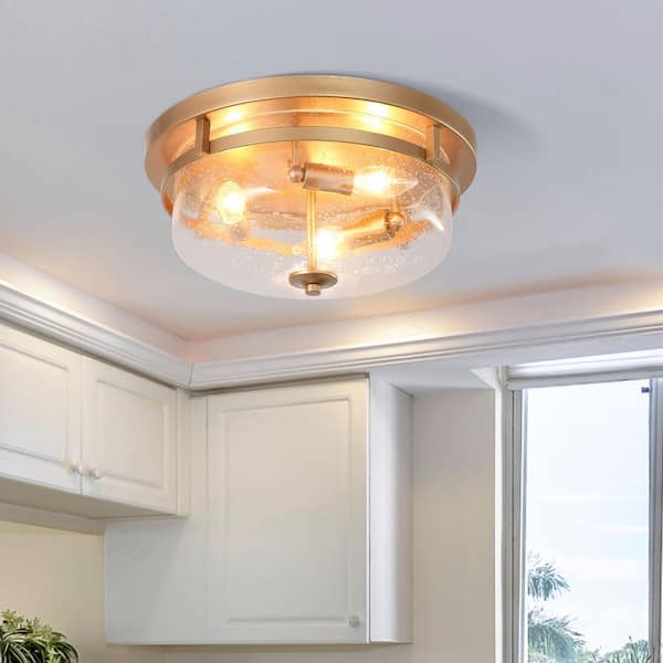 13.5 in. 3-Light Gold Drum Flush Mount Light Modern Circle Ceiling Light with Clear Seedy Glass Shade for Entry Kitchen