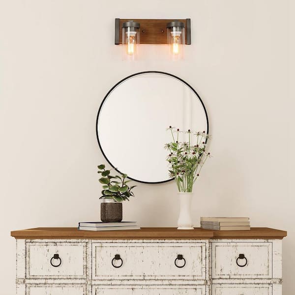 14 in. 2-Light Brushed Aged Silver Bathroom Vanity Light Rustic Wall Sconce with Brown Faux Wood Plate and Clear Glass