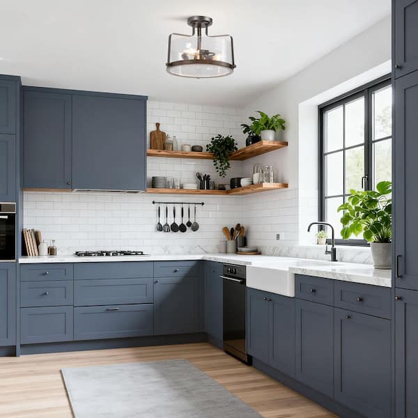 14 in. 3-Light Black Semi-Flush Mount Ceiling Light with Seeded Glass Shade