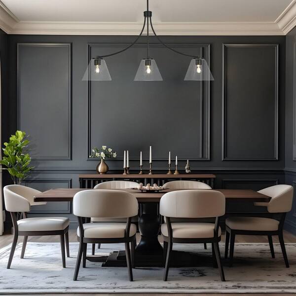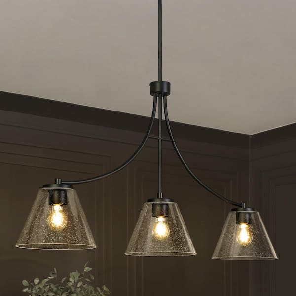 42.1 in. Modern 3-Light Black Island Chandelier Industrial Liner Hanging Ceiling Light with Bell Seeded Glass Shades