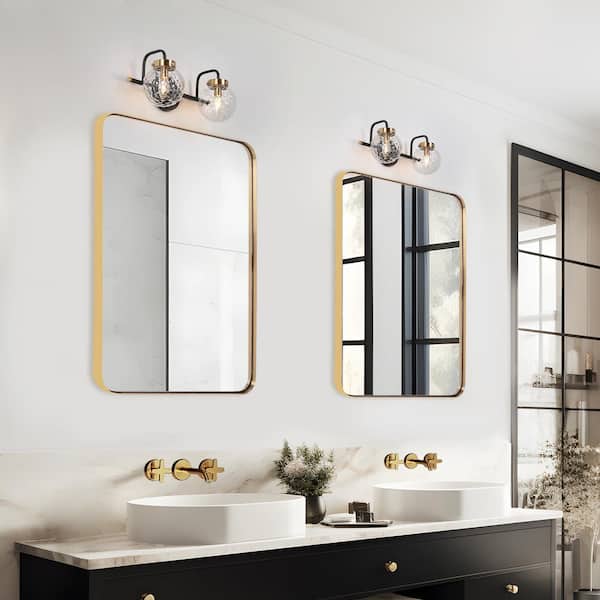ASTRID Modern 15 in. 2-Light Black Vanity Light Brass Wall Sconce with Textured Globe Glass Shades