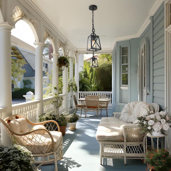 • Outdoor hanging lantern with black frame and seedy glass shade