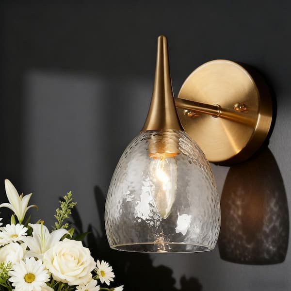 Brass 1-Light Wall Sconce Modern Dome Hammered Glass Shade Powder Room Bathroom Vintage Vanity Light