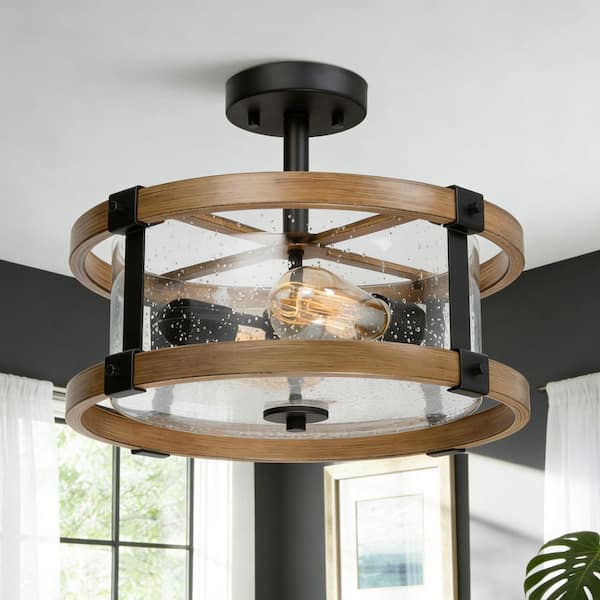 Drum Semi Flush Mount 2-Light Black Modern Bedroom Ceiling Lighting with Round Seedy Glass and Wood Grain Finish