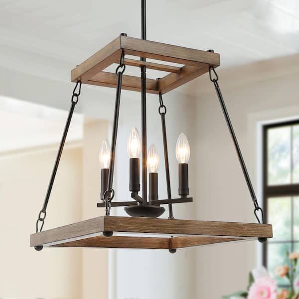 Eniso Industrial Black Candlestick Chandelier with Open Cage Shade Farmhouse Island Chandelier with Faux Wood Grain
