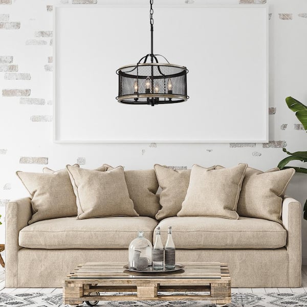 Eniso Modern Farmhouse Black Chandelier 4-Light Candlestick Island Mesh Cage Drum Chandelier with Faux Wood Accents