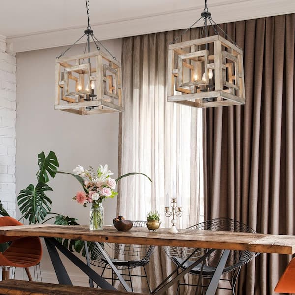 Farmhouse 13.5 in. 4-Light Brown Cage Chandelier Solid Wood Lighting Kitchen Island Ceiling Light with Square Frame