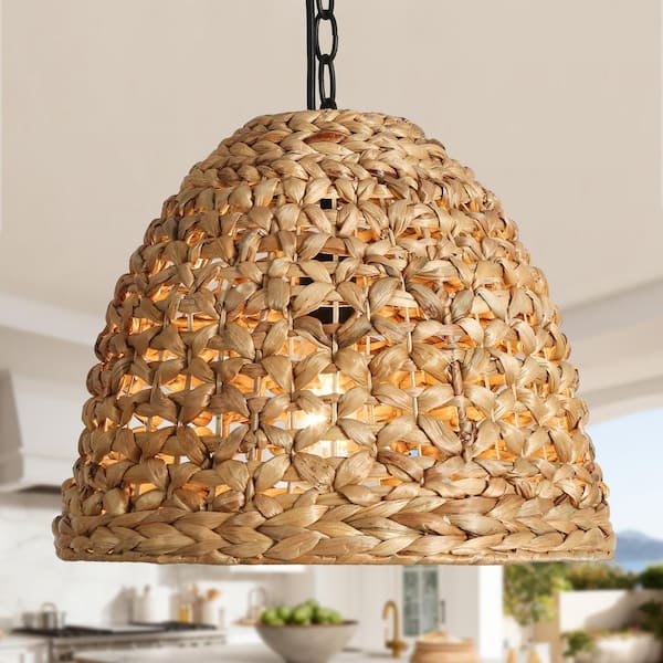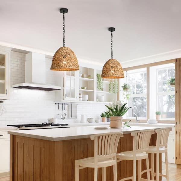 Farmhouse 15 in. 1-Light Brown and Black Pendant Light with Natural Handmade Rattan Shade Island Light for Dining Table