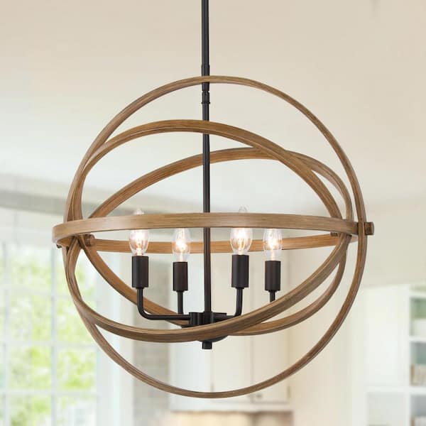 Farmhouse Chandelier 4-Light Globe Cage Classic Black Candlestick Island Pendant Chandelier with Faux Wood Accent