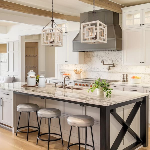 Farmhouse Lantern Square Cage Antique White Wood Chandelier 4-Light Bronze Candlestick Pendant Lamp Window Lattice Shade
