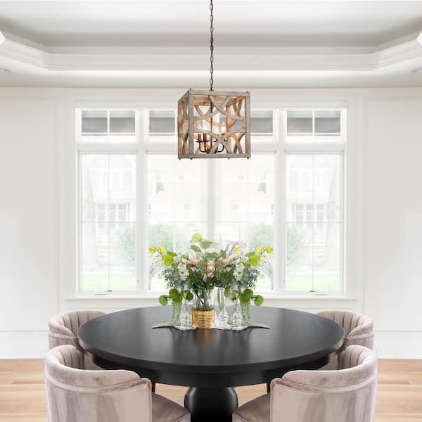 Farmhouse Modern Brown Wood Candlestick Chandelier 4-Light Rustic Square Adjustable Cage Pendant Light with Rusty Accent