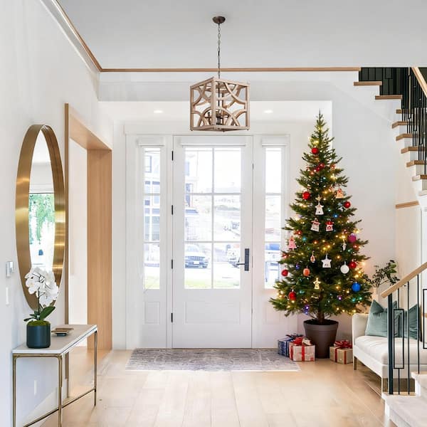Farmhouse Modern Brown Wood Candlestick Chandelier 4-Light Rustic Square Adjustable Cage Pendant Light with Rusty Accent