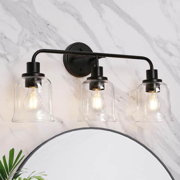 Modern 22.8 in. 3-Light Black Bathroom Vanity Light with Bell Clear Glass Shades Contemporary Wall Sconce Over Mirrors