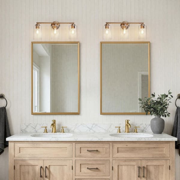 Modern 22.8 in. 3-Light Plated Brass Bathroom Vanity Light with Classic Cylinder Clear Glass Shade LED Compatible Sconce