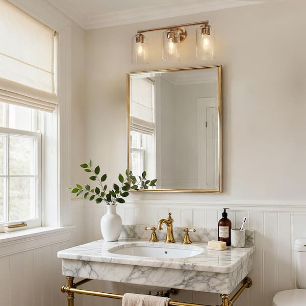 Modern 22 in. 3-Light Plated Brass Bath Vanity Light with Clear Glass Shades Powder Room Wall Light, LED Compatible