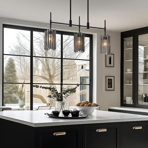 Modern 30 in. Flat Black Linear Chandelier with Drum Mercury Glass Shades Island Pendant for Dining Room, LED Compatible