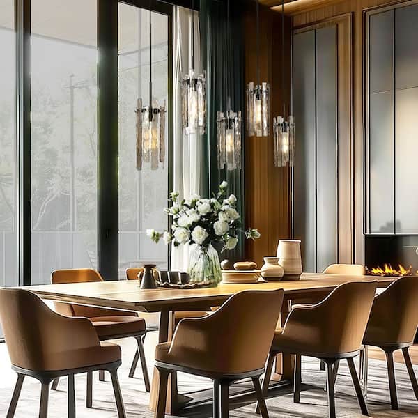 Modern 5-Light Matte Black Chandelier Linear Island High Ceiling Light with Drum Gray Textured Glass Shade