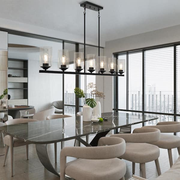 Modern 53.1 in. 7-Light Black Chandelier Clear Glass Shades Industrial Island Lights for Kitchen Island and Dining Table