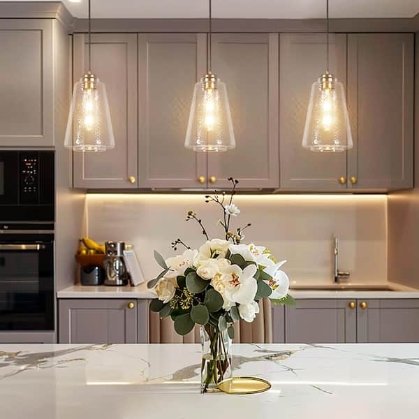 Modern 60-Watt 1-Light Satin Gold Bell Pendant Light with Hammered Glass Shade and No Bulbs Included