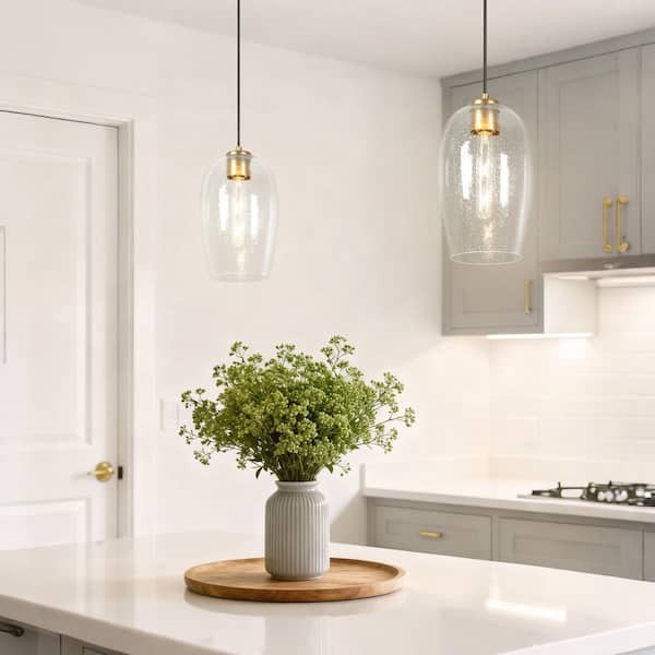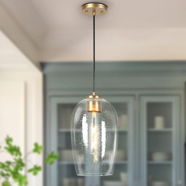 Modern 60-Watt 1-Light Satin Gold Oval Pendant Light with Seedy Glass Shade and No Bulbs Included