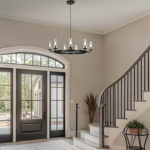 Modern Black 31 in. 9-Light Wagon Wheel Chandelier Round Island Candlestick Chandelier with Cylinder Clear Glass Shades