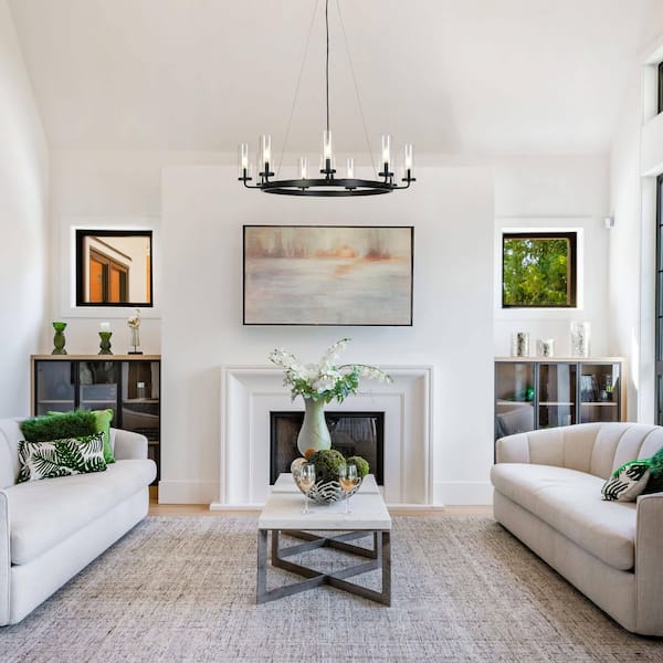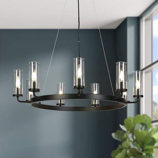 Modern Black 31 in. 9-Light Wagon Wheel Chandelier Round Island Candlestick Chandelier with Cylinder Clear Glass Shades
