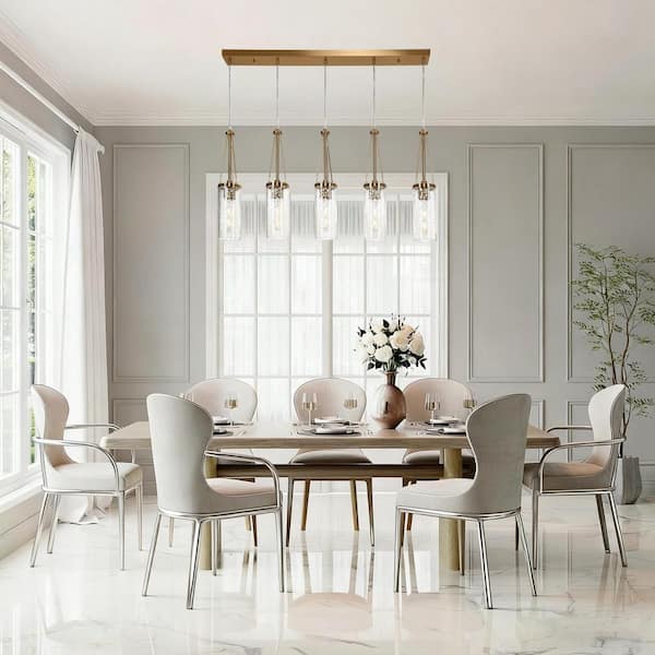 Modern Brass Island Linear Chandelier 5-Light Drum Cylinder High Ceiling Light with Hammered Glass Shades for Kitchen