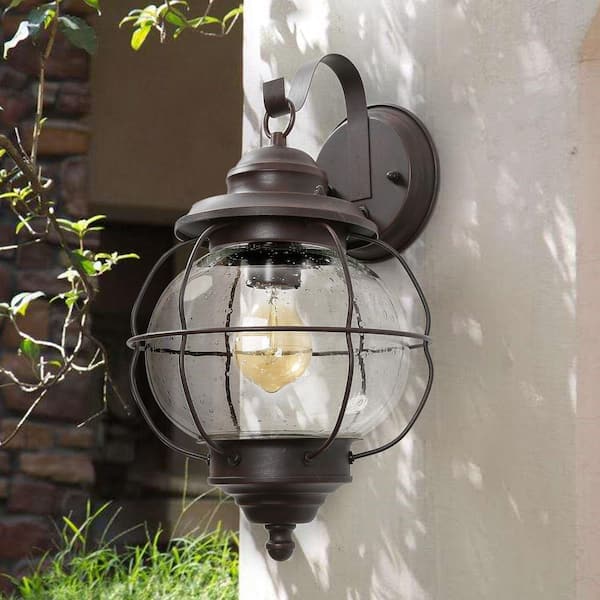 Modern Bronze Outdoor Wall Sconce Coastal Industrial 1-Light 10 in. Coach Light with Cage-Seeded Glass Shade