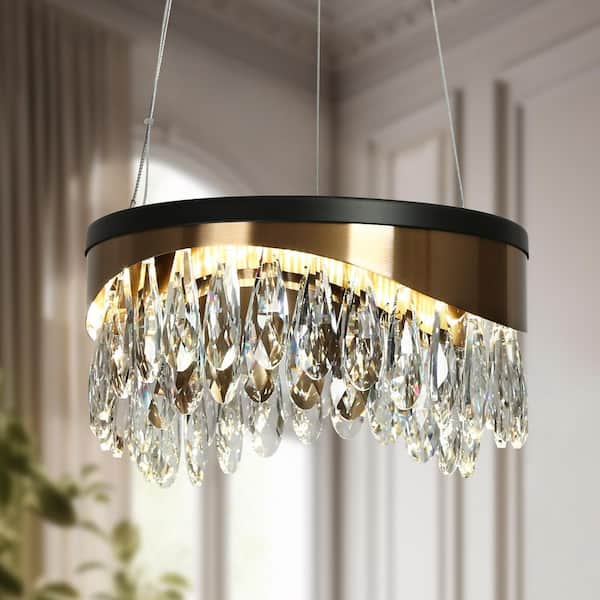 Modern Chandelier 1-Light Glam Drum Plating Brass and Matte Black Integrated LED Foyer Chandelier with Crystal Accents