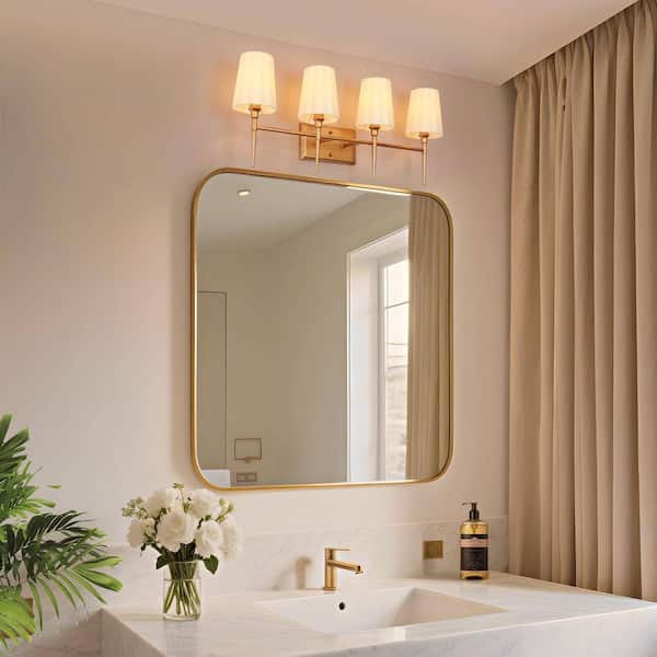 Modern Classic Deep Gold Vanity Light 4-Light Arched Mirror Sconce with White Cone Fabric Shades for Powder Room
