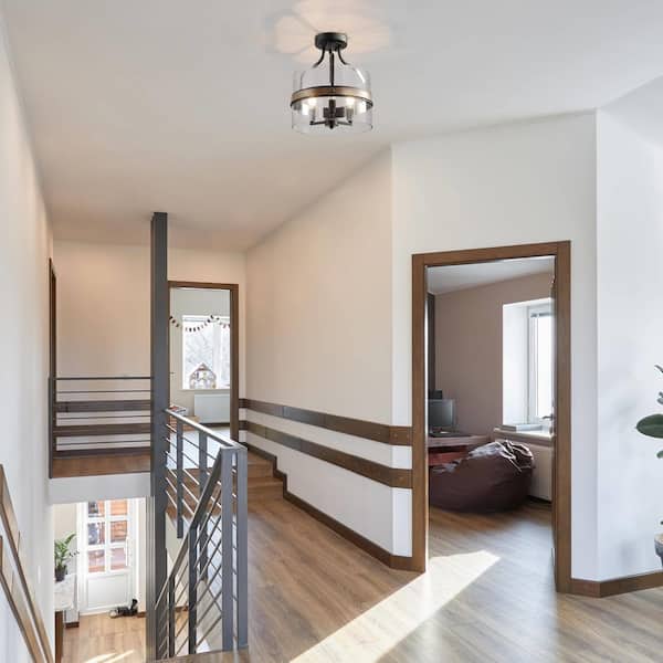 Modern Farmhouse 12 in. Dark Gray Drum 3-Light Semi-Flush Mount Ceiling Light with Faux Wood Accent Clear Glass Shade