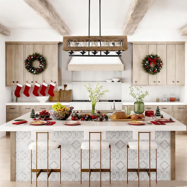 Modern Farmhouse Chandelier 32 in. W Black Rectangular Dining Room Chandelier, 5-Light Kitchen Island Wood Pendant Light